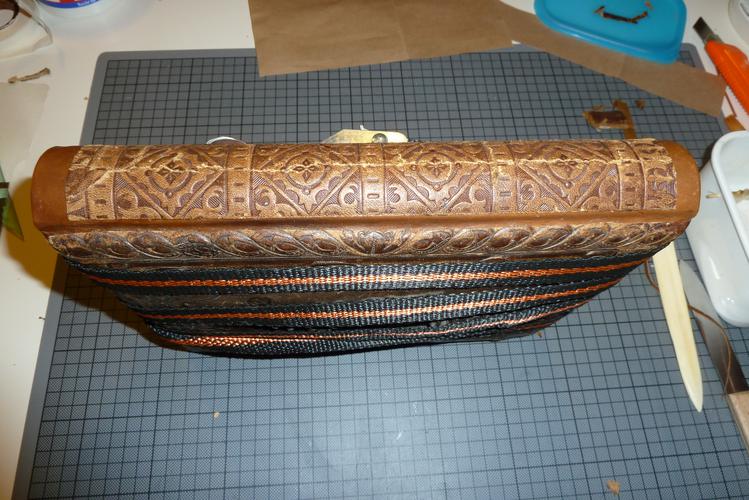 der Rücken in einzelnen Teilen abgefallen. Ein eigens eingefärbter neuer Lederrücken stellt nach der Reparatur